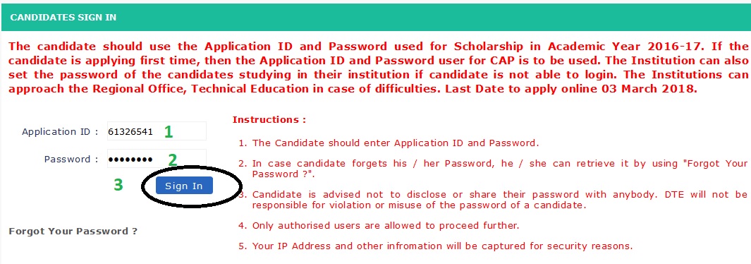 The candidate should use the Application ID and Password used for Scholarship in Academic Year 2016-17. If the candidate is applying first time, then the Application ID and Password user for CAP is to be used.
