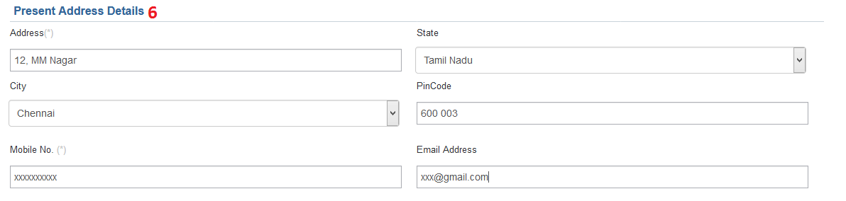 Step-6 : After that, Enter the Present Address Details like Address, City, State, Pin Code Mobile Number and Email Address.