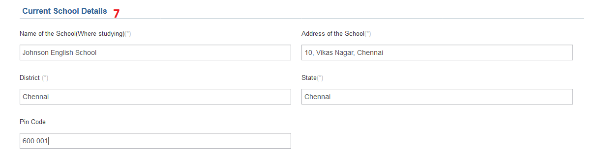 Step-7 : Enter the Current School Details like Name of the School (Where studying), Address of the School, District, State and Pin Code.
