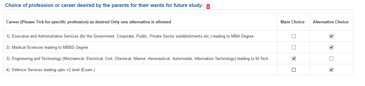 Step-8 : Select the Choice of profession (or) career desired by the parents for their wards for future study.