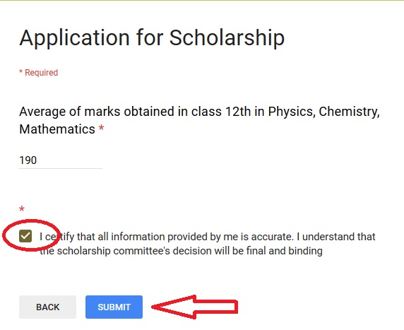 Step 6 : Enter your Average of marks obtained in class 12th in Physics, Chemistry, Mathematics then accept the terms & conditions and click Submit button.