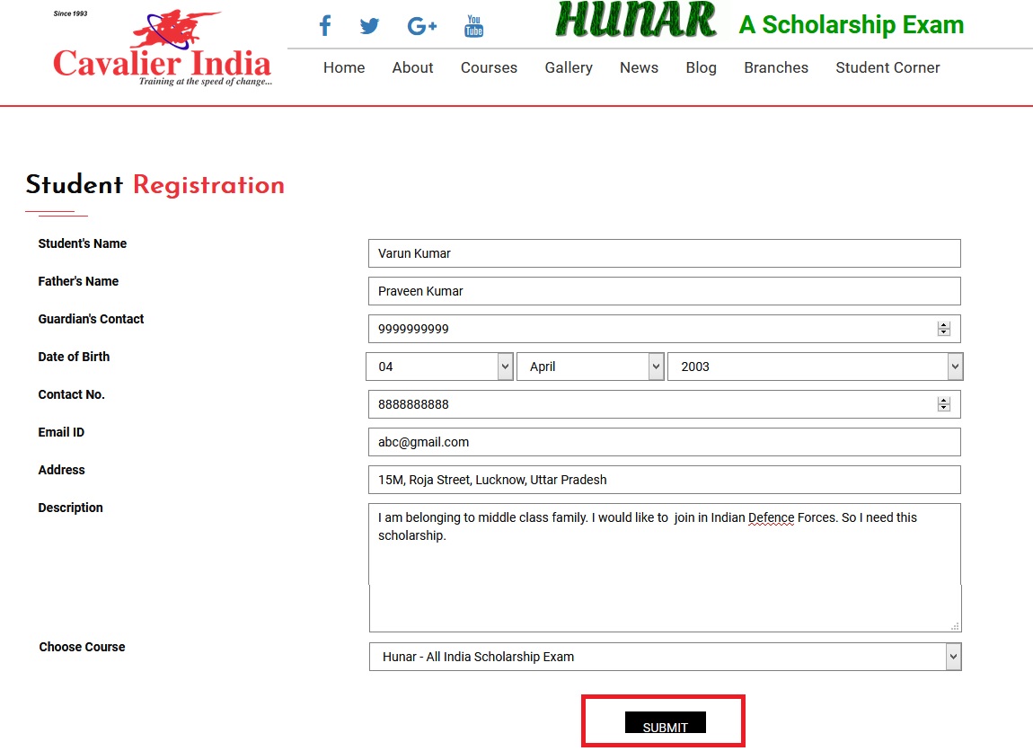 It is a Scholarship exam for those who wants to join Indian Defence Forces but some money problem is occurring in his/her family. They have to come and join the Cavalier India’s Program Named “Hunar”. we are providing a scholarship for those who have ability & eligibility.