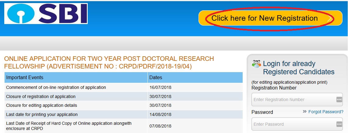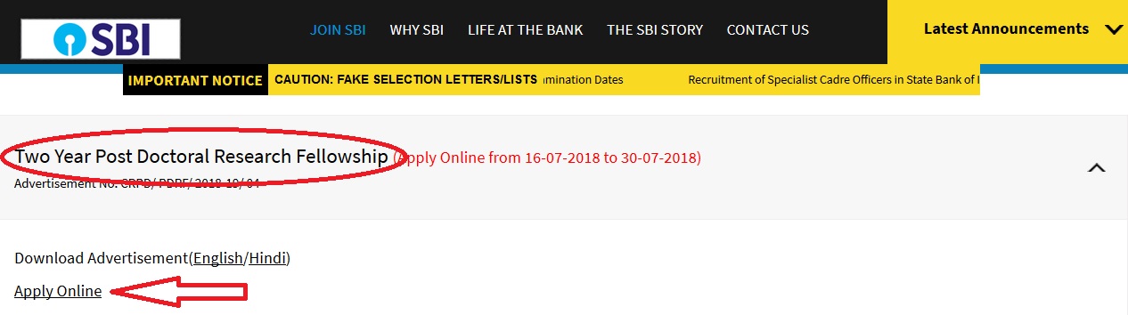 Just follow the below steps to apply for the SBI Two Year Post Doctoral Research Fellowship 2018-19.