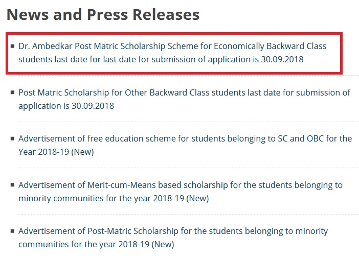 Last date for submission of Dr. Ambedkar Post Matric Scholarships application is 30.09.2018