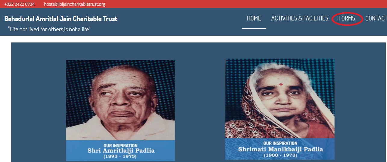 Step 1 : Visit the official website of Bahadurlal Amritlal Jain Charitable Trust and Click on the Forms link in the Menu bar.