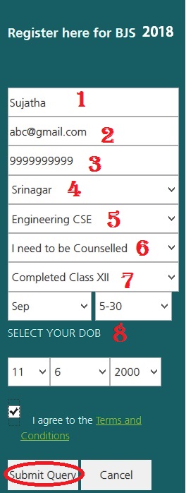 Step 2 : Fill the registration form with the following details and Click on Submit Query button