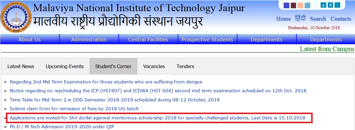 MNIT Shri Dorilal Agarwal Meritorious Scholarship 2018 : Malaviya National Institute of Technology Jaipur