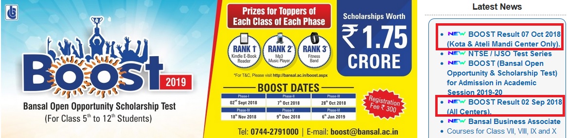 Bansal Classes BOOST Result Phase I & II 2019 : Open Opportunity & Scholarship Test