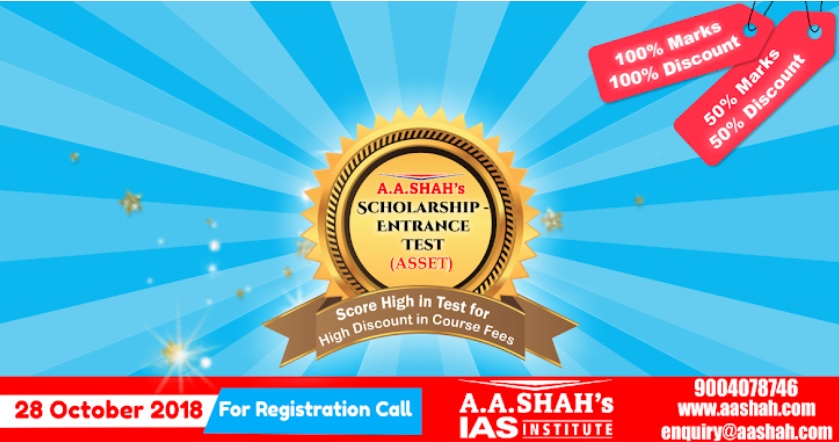 A A Shah’s IAS Institute invites applications for ASSET (A A Shah’s Scholarship-cum-Entrance Test) 2018.