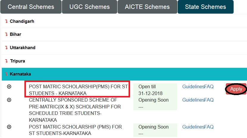 Step 3 : After that Click Apply link in the “Post Matric Scholarship(PMS) For ST Students” under Karnataka