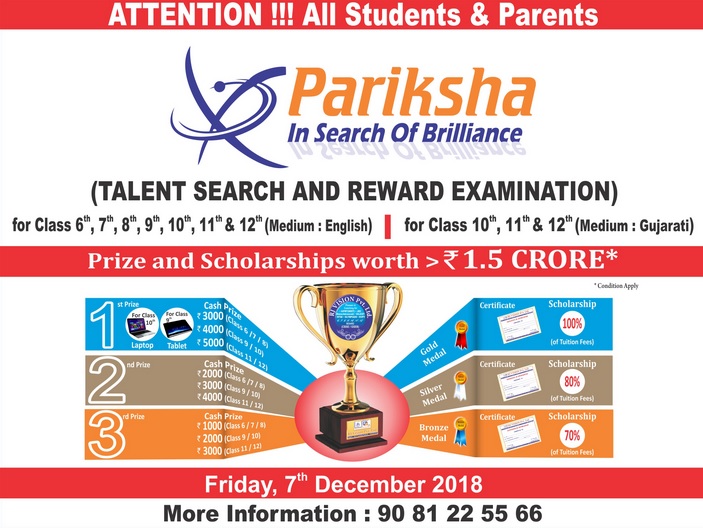 RJ Vision Pvt. Ltd conducting “Pariksha – In Search of Brilliance”-2018. Talent Search and Reward Examination for class 6th to 10th students, Usually held on December