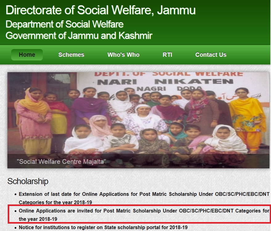 jkdswdj.jk.gov.in Post Matric Scholarship For OBC/SC/PHC/EBC/DNT Students 2018-19 : Jammu Kashmir Social Welfare Department