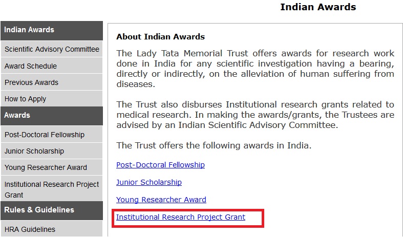 Lady Tata Memorial Trust Institutional Research Project Grant 2020 : ladytatatrust.org