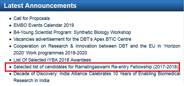 Announcement : Selected Candidates List For Ramalingaswami Re-entry Fellowship 2017-18