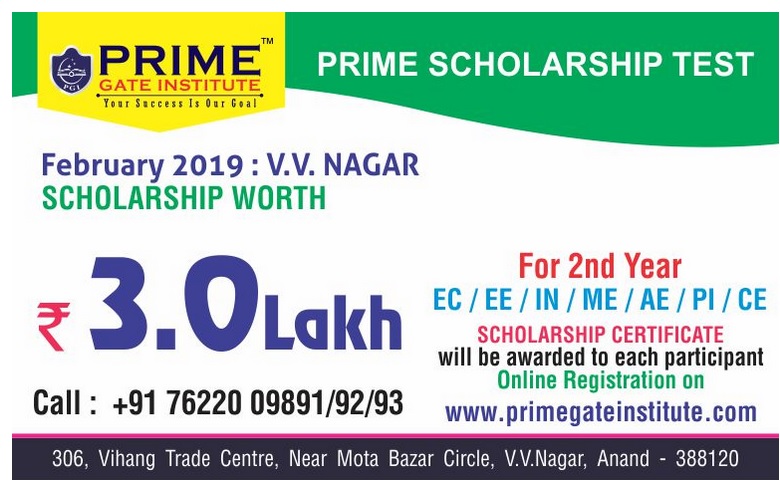 Prime Gate Institute organizing Prime Scholarship Test-2019 VV Nagar for the students who are strongly willing to take the chance.