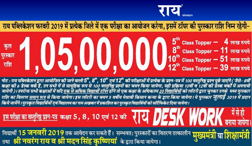 The Rai Publication will organize the Scholarship Exam district wise in Rajasthan State. It will select maximum 20 Topper students by lottery from each class for the scholarship and the prize will be distributed equally among all of them.