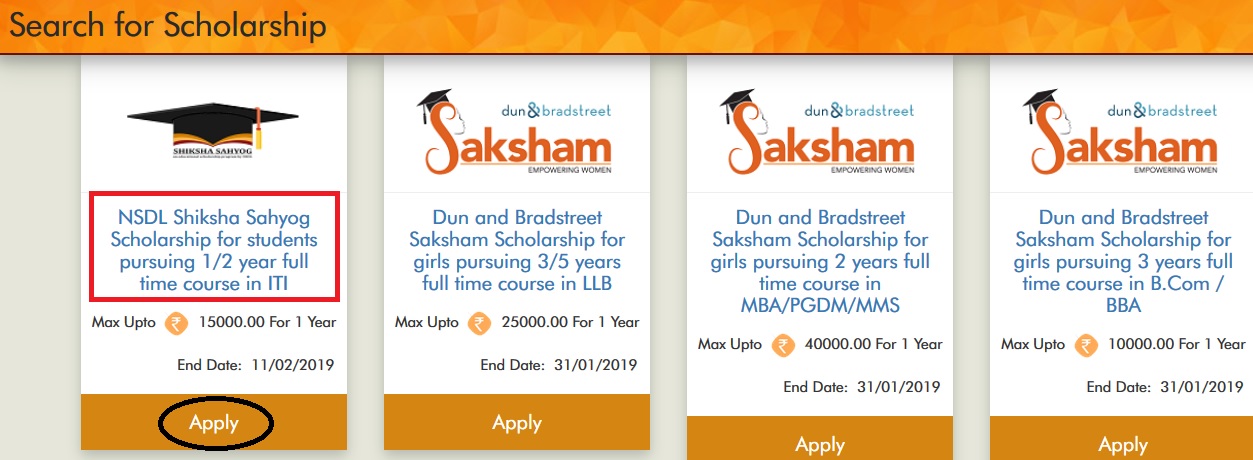 Search for relevant ‘NSDL Shiksha Sahyog Scholarship For ITI Students’ schemes in which you are eligible and apply for scholarship.