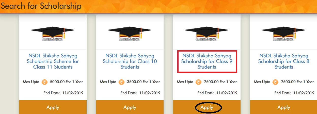 Search for relevant ‘NSDL Shiksha Sahyog Scholarship For Class 9th Students’ schemes in which you are eligible and apply for scholarship.