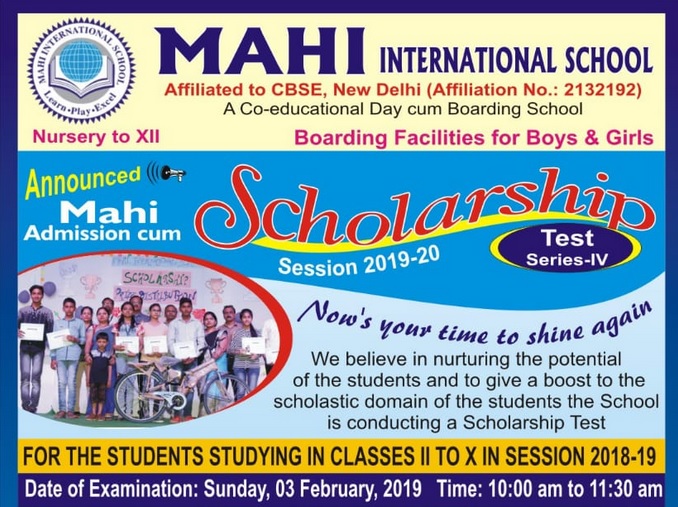 Mahi International School believes in nurturing the potential of students and to give a boost to the scholastic domain of students the school is conducting Scholarship Test (Series-IV) for the students studying in classes II to X in Academic Session 2018-19