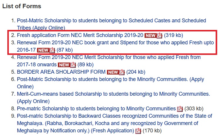 Fresh and Renewal applications are invited from the students who are permanent residents in the State of Meghalaya studying within and outside the state for the year 2019-20 for grant of North Eastern Council Merit Scholarship (for those who are applying as fresh from 2017-18 on wards)/NEC Book Grant and Stipends (for those who applied as fresh before 2017-18) for the General, SC/ST students undergoing Vocational/Technical courses.