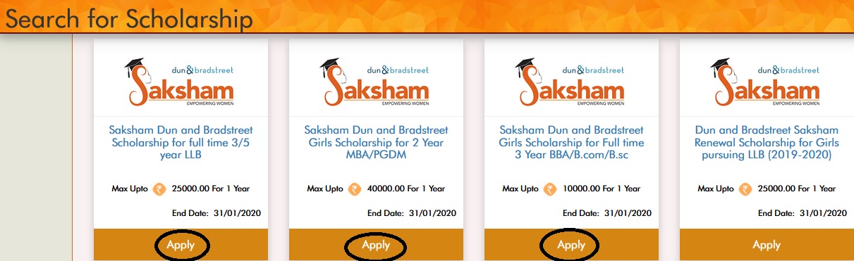 Search for relevant ‘Saksham Dun & Bradstreet Girls Scholarship’ schemes in which you are eligible and apply for scholarship.