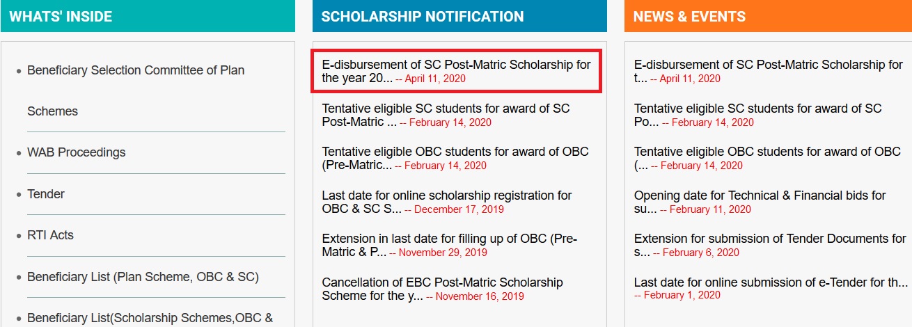 Step 2 : Then click on the link “E-disbursement of Scholarship for the year 2019-20” under the Latest Scholarship Notifications tab.