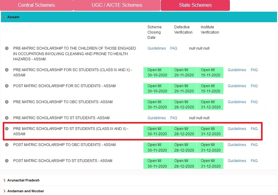 ** Pre Matric Scholarship For ST Class IX & X Assam Scheme Closing Date is 30-11-2020