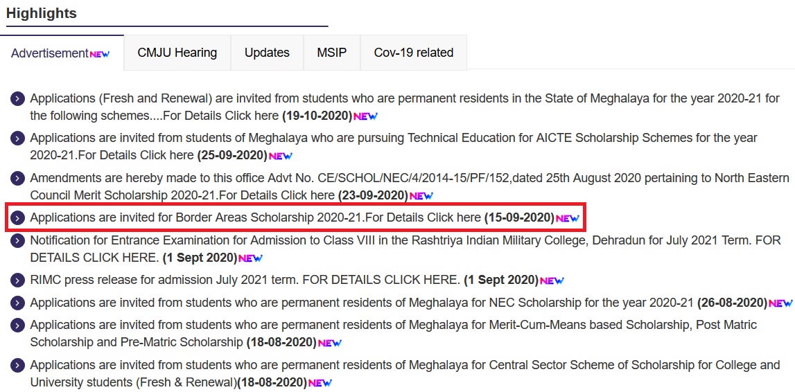 megeducation.gov.in Border Areas Scholarship 2020-21 : Meghalaya Education