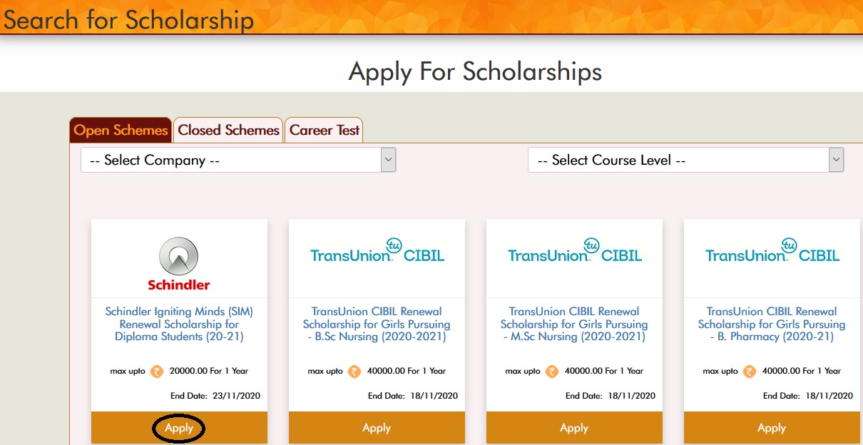 Search for relevant ‘Schindler India Renewal Scholarship’ schemes in which you are eligible and apply for scholarship.