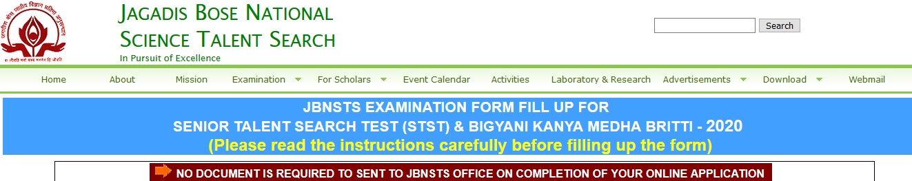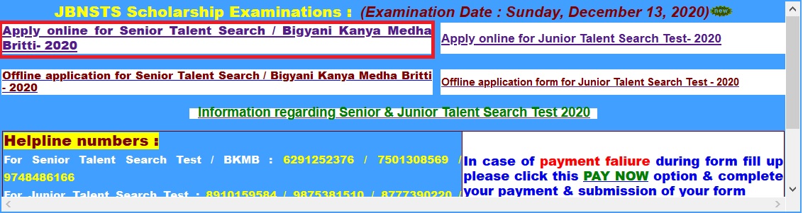 Step 4 : If you are ready with these above mentioned documents, start your application for JBNSTS STST / BKMB 2020 by clicking in the tab “Apply online for SENIOR TALENT SEARCH TEST”