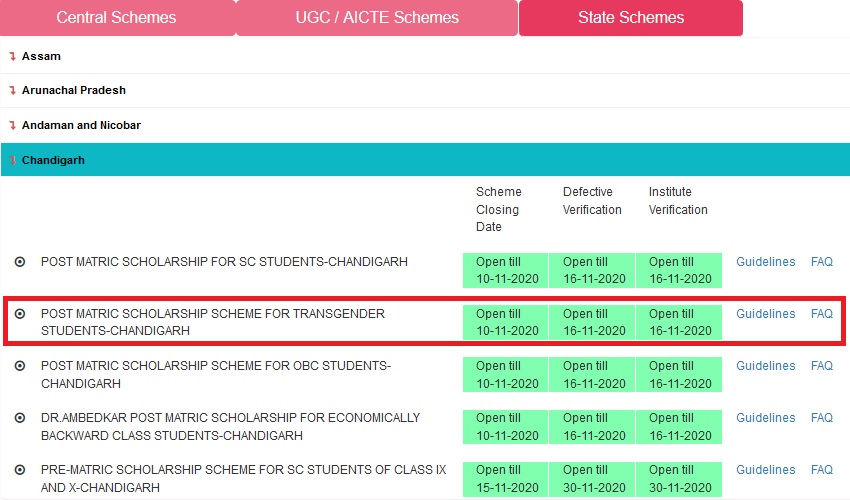 scholarships.gov.in NSP Chandigarh Post Matric Scholarship For Transgender Students 2020-21