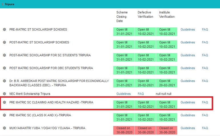 National Scholarship Portal NSP Tripura : Pre Matric SC Cleaning & Health Hazard 2020-21