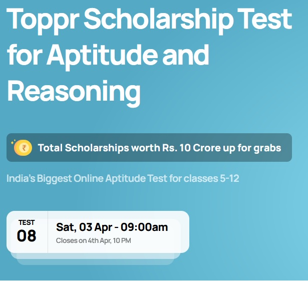 Toppr Scholarship Test for Aptitude and Reasoning – India’s Biggest Online Aptitude Test for classes 5-12. Total Scholarships worth Rs. 10 Crore up for grabs