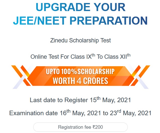 Upgrade Your JEE/NEET Preparation Zinedu Scholarship Test 2021 Online Test for Class IXth to Class XIIth
