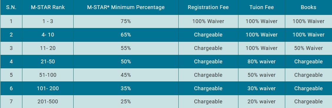 1. Cash rewards, Scholarship & other benefits will be decided on the basis of performance in the M-STAR* rank subject to minimum marks as mentioned above. Student will have to qualify both rank and minimum percentage criteria to get rewards. If a student lies in two row of above table by different criteria then he/she will be getting lower cash reward.