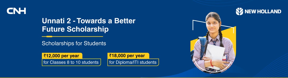 Unnati 2-Towards a Better Future Scholarship is an initiative of CNH Industrial (India) Private Limited that aims to provide financial assistance to underprivileged and meritorious students from Gurgaon, Delhi and Noida. Under this scholarship, the students who are studying in Classes 8 to 10 will get ₹12,000 per year for up to three years, covering their academic expenses. Last date of application is 17th August 2025.