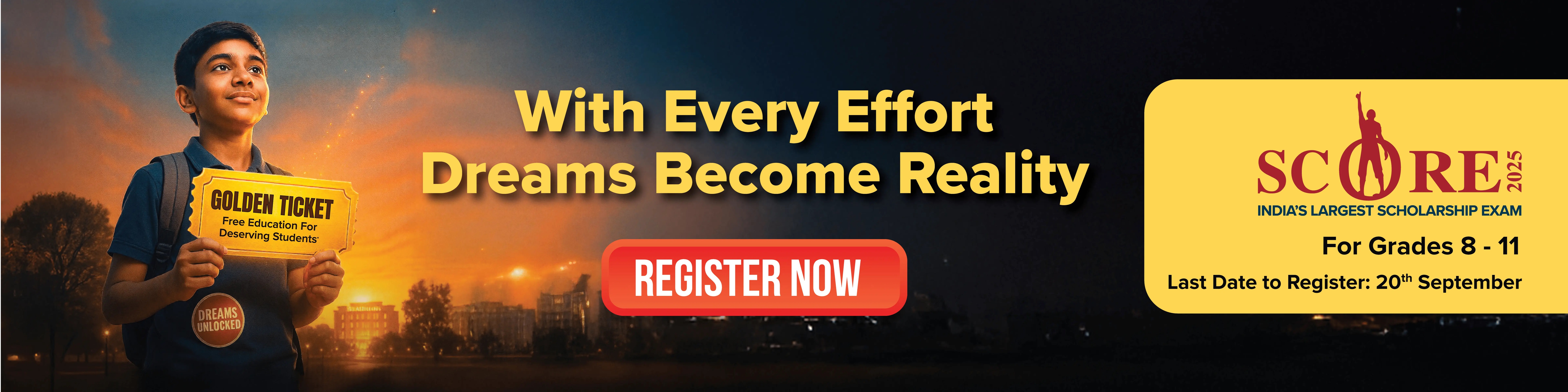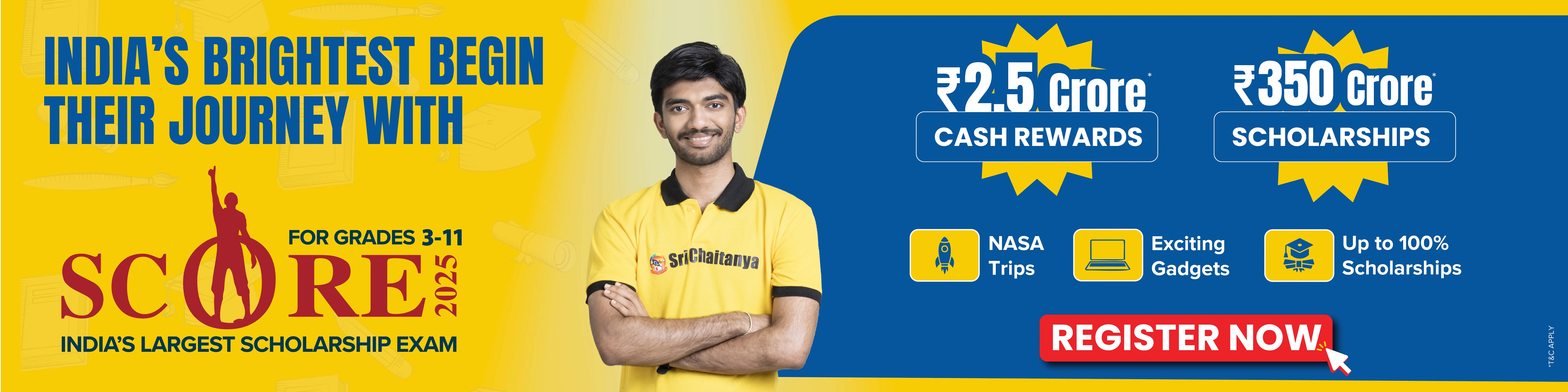 The SCORE is an All-India Scholarship and Talent Seach Exam. Sri Chaitanya Educational Institutions organizes this exam, to identify and reward talented students from Class 3 to Class 12. The primary objective of the SCORE Scholarship Exam 2025 is to offer financial support, upto 100% scholarships, and rewards including educational trips to NASA, exciting gadgets and cash prizes to the deserving students. The exam is scheduled on 28 September 2025 and 12 October 2025. Last date of registration is 20th September 2025.