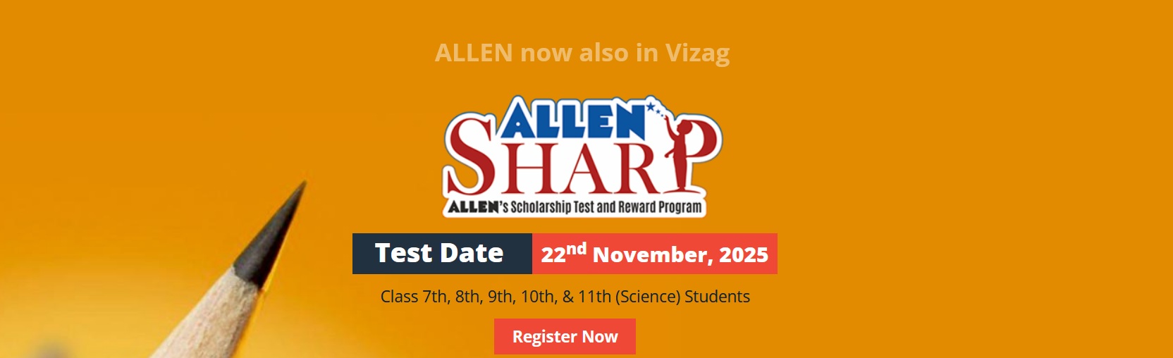 ALLENSharp is ALLEN Career Institute’s Scholarship Test & Reward Program for students currently studying in class VII to XI (Science) in Vizag (Andhra Pradesh), where we will start classroom courses for upcoming Academic session. It is a platform through which a student can Test his academic abilities, Win rewards and Seek further career guidance. Last Date of Registration is 16th November 2025. Exam will be held on 22nd November, 2025.