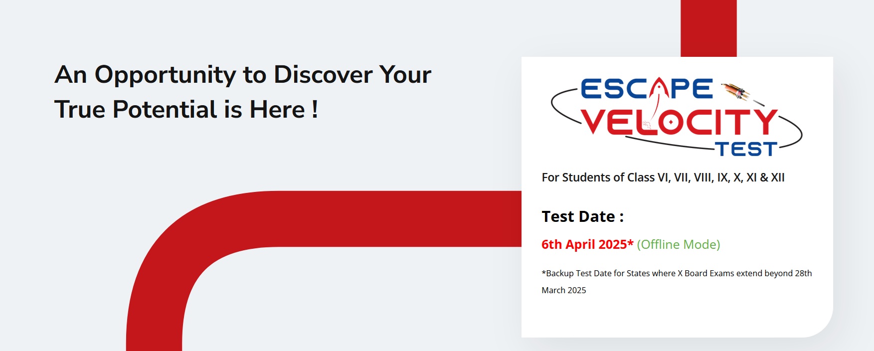The Escape Velocity Test is also a Scholarship cum Admission Test to join a FIITJEE Classroom / Integrated School / Live Interactive Online Classroom Program. The Test will be conducted in an offline as well as Online Proctored mode. Students of Class VI, VII, VIII, IX, X, XI & XII can enter. Exams will be held on 30th March, 2nd April 2025 & 6th April 2025.