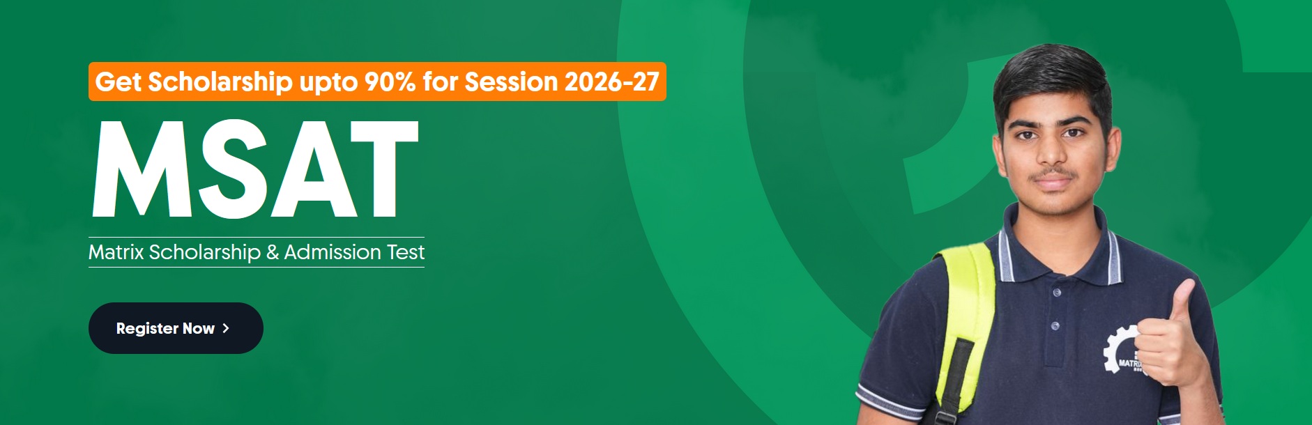 MSAT stands for Matrix Scholarship Admission Test which is an entrance-cum-scholarship exam for students moving to Class VI to XII and XII Passed, offering an opportunity to get up to 90% scholarship on Matrix courses, including Pre-Foundation, JEE Main & Advanced, and NEET preparation. Successful participants can enroll in their desired Matrix classroom programs, paving the way for academic excellence and a brighter future.