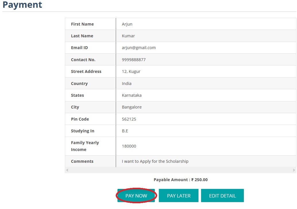 After Complete the Registration Form it will navigate to the Payment Section. Click on the ‘Pay Now’ button to proceed with the payment.