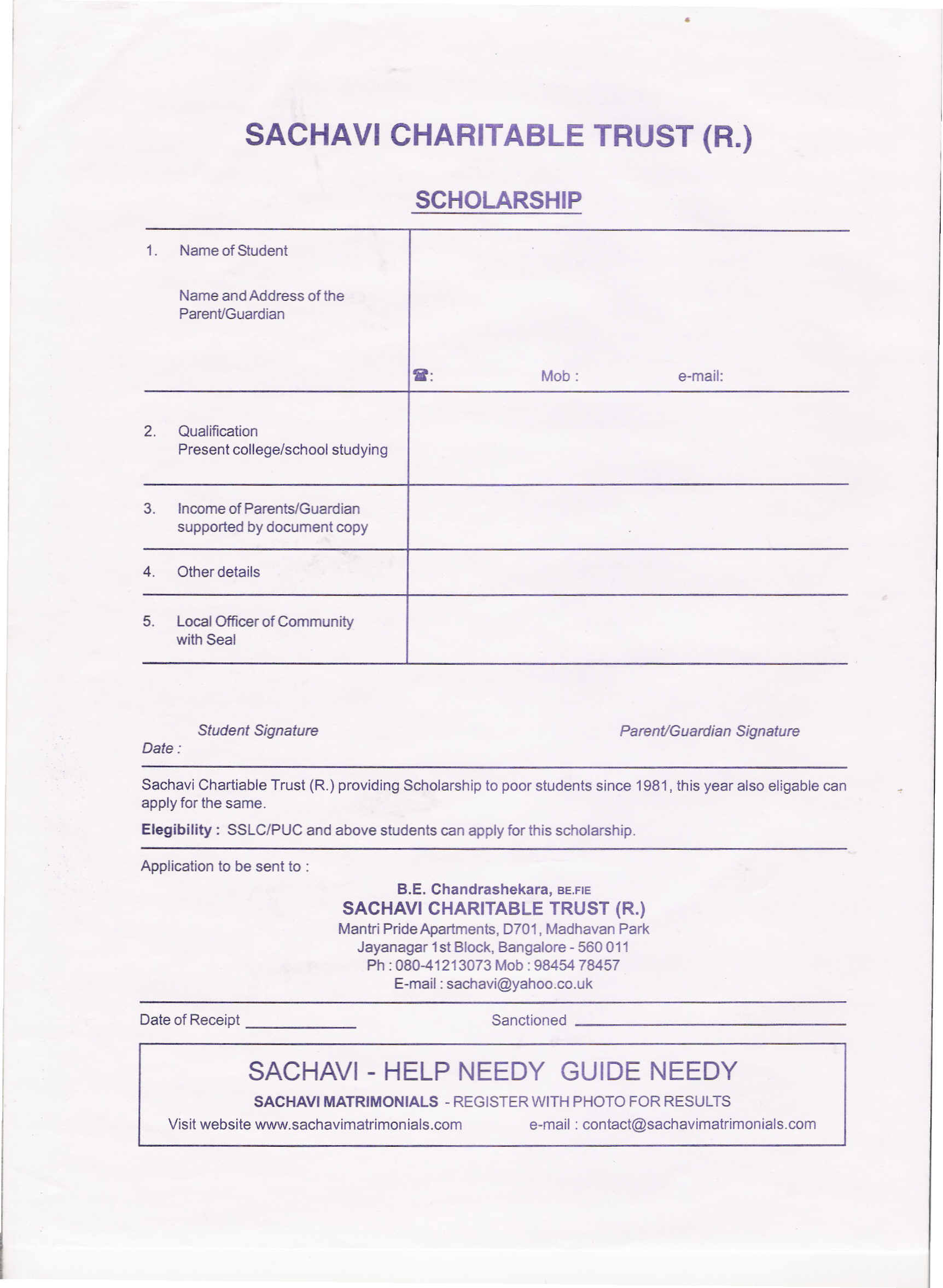 For Rotary Bangalore South we Rotarians are members and it provides Scholarships to Students of all colleges in and around Bangalore visit website www.rotarybangaloresouth.org for details